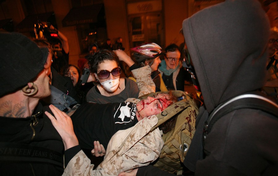 Read moreScott Olsen, an Iraq War veteran, and part of the Occupy Wall Street movement, is carried away by fellow protesters after Olsen was hit by a tear gas canister shot by the Police, near the Oakland City Hall, on October 25, 2011 in California. After initially being listed in critical condition, Olsen was released in November, but is still recovering from a brain injury that has affected his speech. #