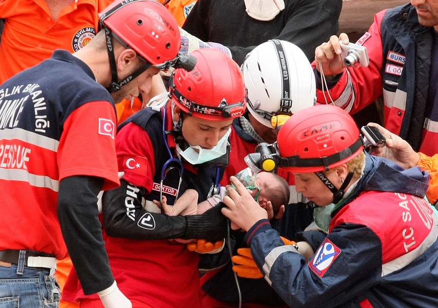Read moreRescue workers carry Azra Karaduman, a two-week-old baby girl, from a collapsed building in Ercis, near the eastern Turkish city of Van, on October 25, 2011. The baby was rescued alive from the rubble of a collapsed building on Tuesday, 46 hours after an earthquake struck southeast Turkey, a Reuters Television journalist said. Her mother, Semiha, who was also rescued, had been clasping her daughter to her chest. #