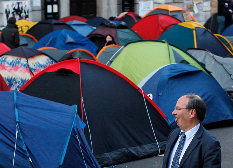 Read moreA businessman sticks his tongue out in jest as he walks past tents erected by protesters from the Occupy London Stock Exchange group, as they continue their demonstration that started on Saturday outside St Paul's Cathedral in London, on October 17, 2011. #