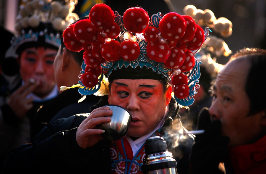 Read moreA performer dressed in traditional costume and wearing makeup drinks tea as he and others prepare to take part in Chinese new year celebrations at the 700-year-old Dongyue Temple in Beijing, on January 23, 2012. The temple is the largest of its kind in northern China for the Zhengyi school of Taoism, and was originally built by Taoist monks in the 14th century. #