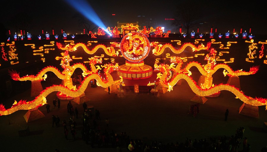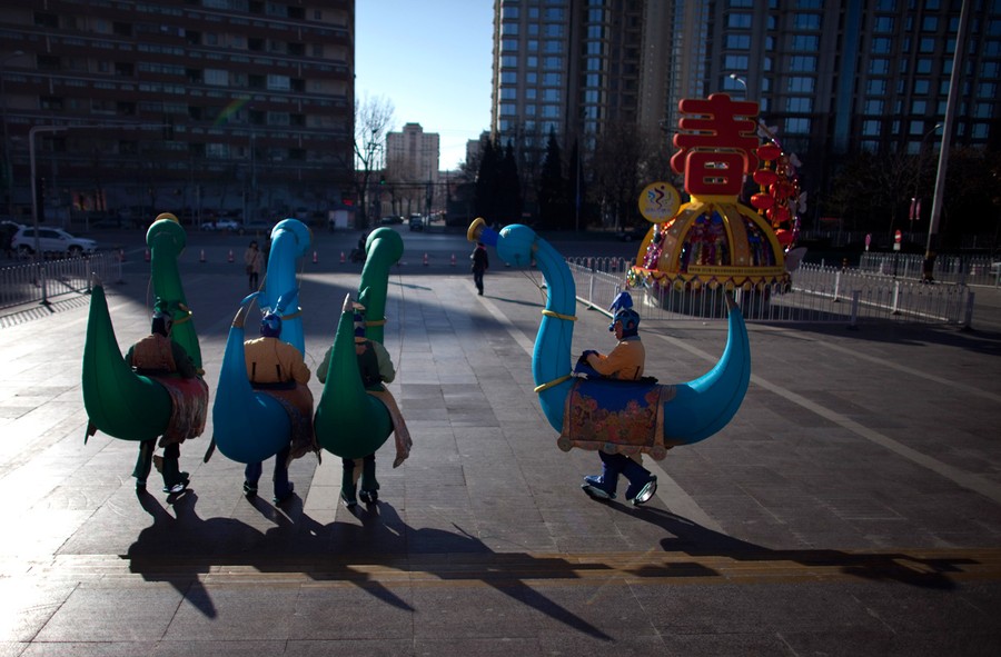 Read moreTemple fair performers with cartoon-dragon-shaped balloon costumes rehearse for upcoming Chinese Lunar New Year, the year of the dragon, near a roadside decoration showing Chinese character "spring" in Beijing, China, on January 22, 2012. #
