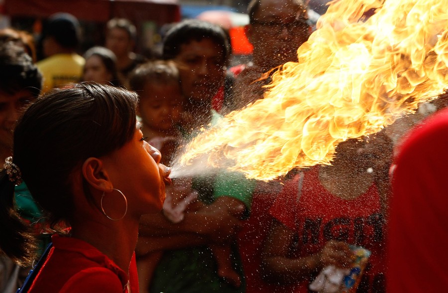 Read moreA performer breaths fire during a dragon dance performance in celebration of the Chinese New Year at Manila's Chinatown district, on January 23, 2012 in the Philippines. #