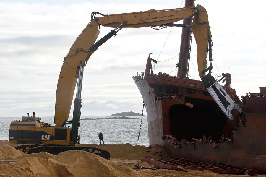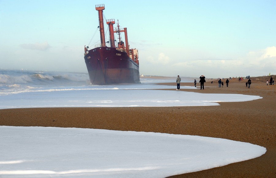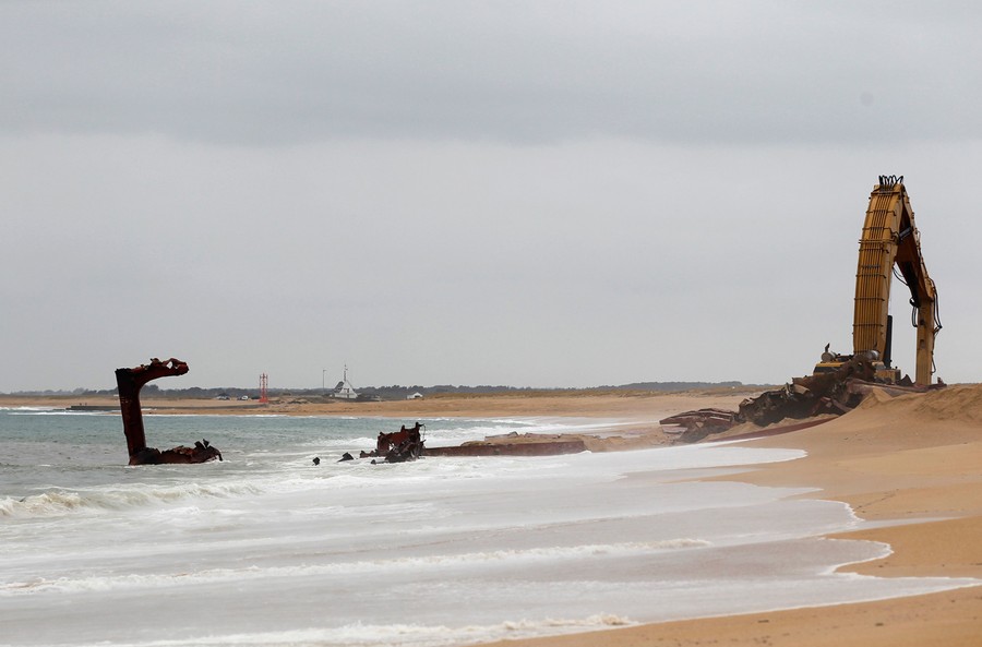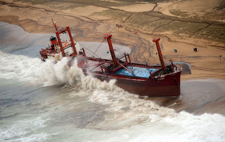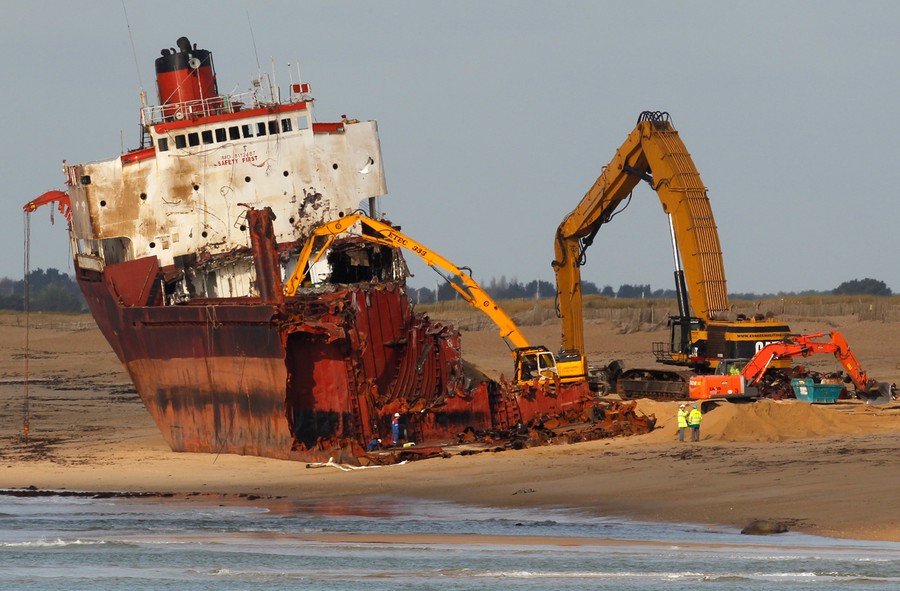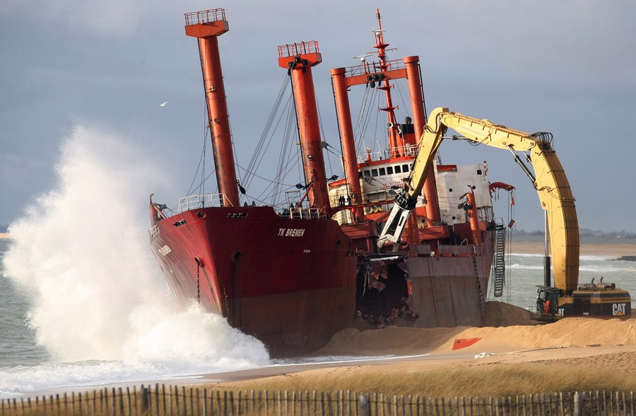 Just over a month ago, the TK Bremen, a Maltese-registered cargo ship, ran aground high on Kerminihy beach in Brittany, France, during a severe storm. The TK Bremen weighed over 2,000 tons, measured 109 meters (330 ft), and was carrying more than 220 tons of fuel oil -- which immediately began leaking. Inspections were made, and the damage was deemed too severe to repair, so salvage and scrapping operations began. The surrounding dunes are part of a nature reserve, so workers took extra precautions as they offloaded the fuel oil, tore the ship apart, and trucked away the pieces. At a cost of nearly 10 million euros (13 million dollars), 40 men worked day and night for two weeks to dismantle the vessel, including its 10-ton engine, and clean up the beach. One month after the wreck, the cleanup process is nearly complete.