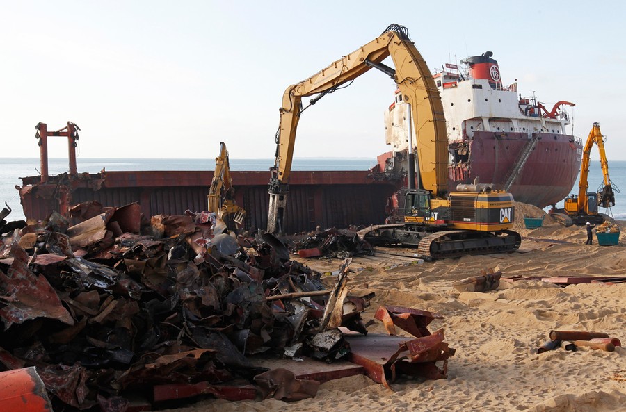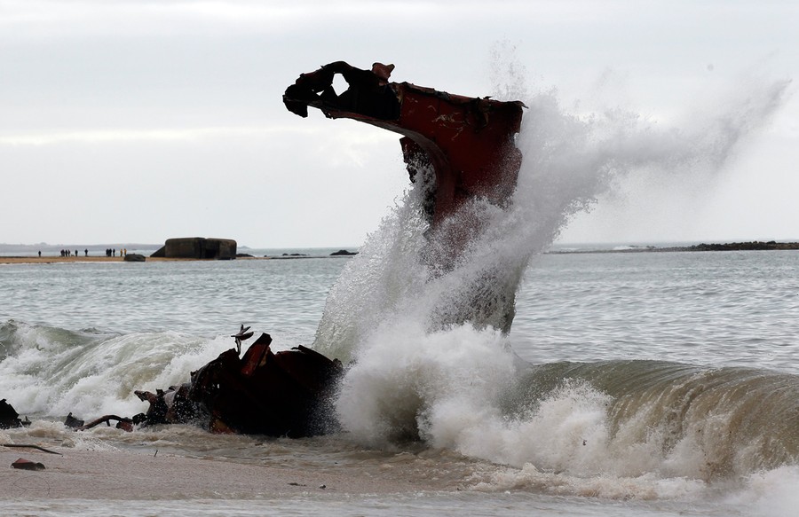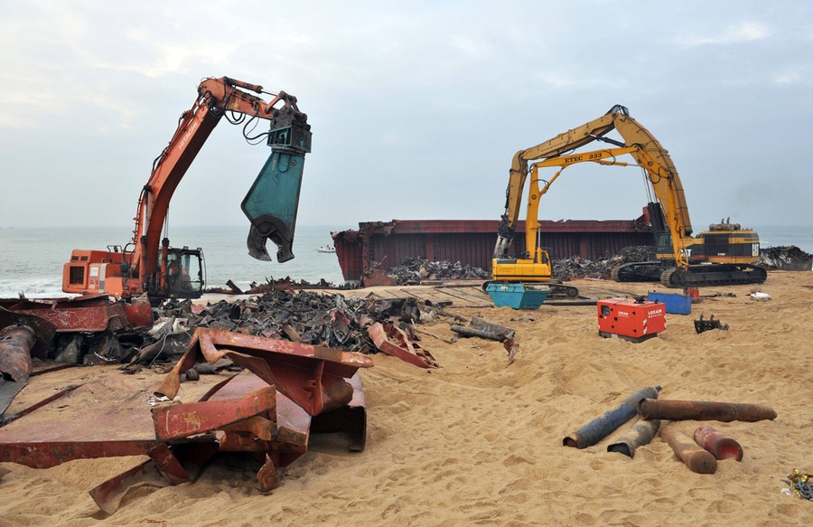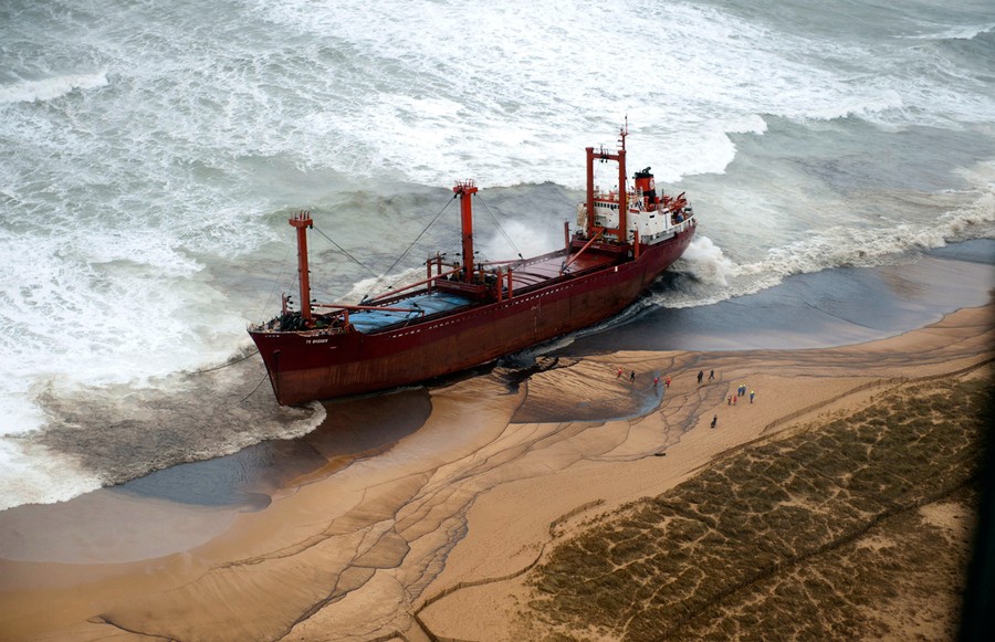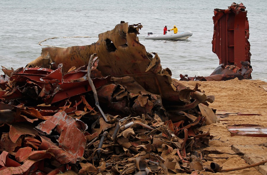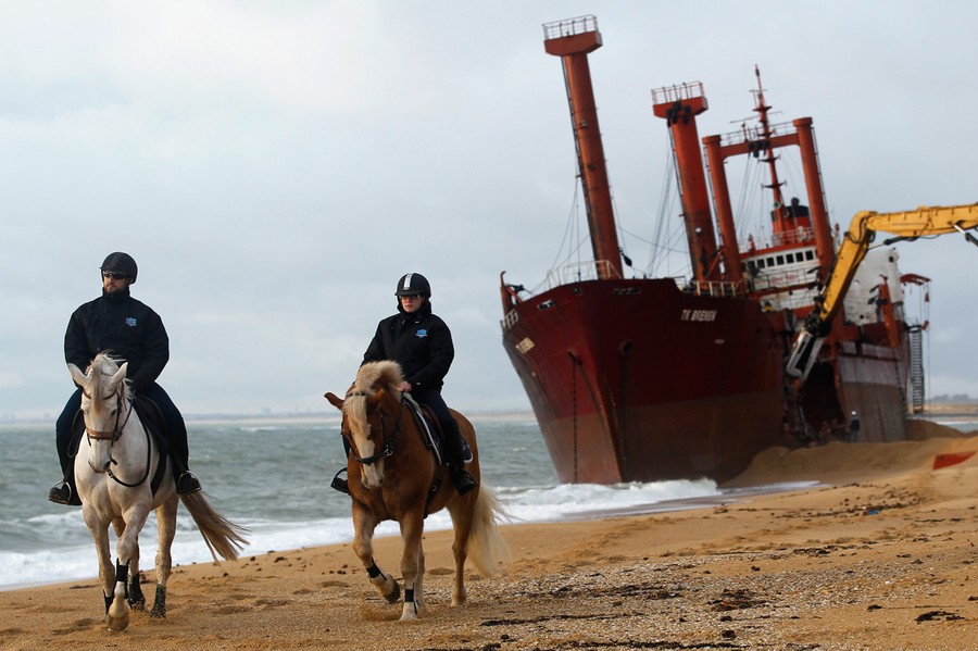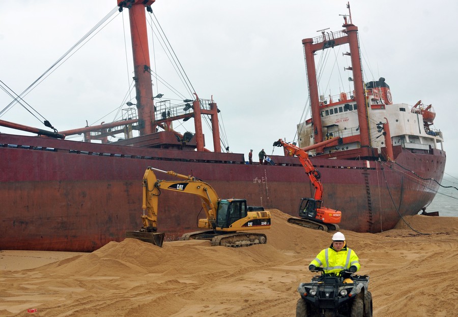 Just over a month ago, the TK Bremen, a Maltese-registered cargo ship, ran aground high on Kerminihy beach in Brittany, France, during a severe storm. The TK Bremen weighed over 2,000 tons, measured 109 meters (330 ft), and was carrying more than 220 tons of fuel oil -- which immediately began leaking. Inspections were made, and the damage was deemed too severe to repair, so salvage and scrapping operations began. The surrounding dunes are part of a nature reserve, so workers took extra precautions as they offloaded the fuel oil, tore the ship apart, and trucked away the pieces. At a cost of nearly 10 million euros (13 million dollars), 40 men worked day and night for two weeks to dismantle the vessel, including its 10-ton engine, and clean up the beach. One month after the wreck, the cleanup process is nearly complete.
