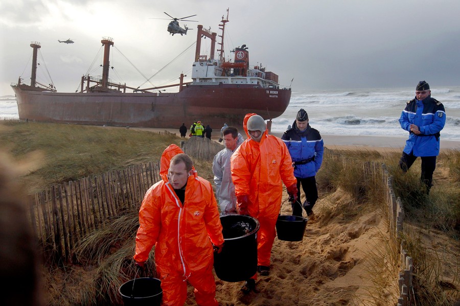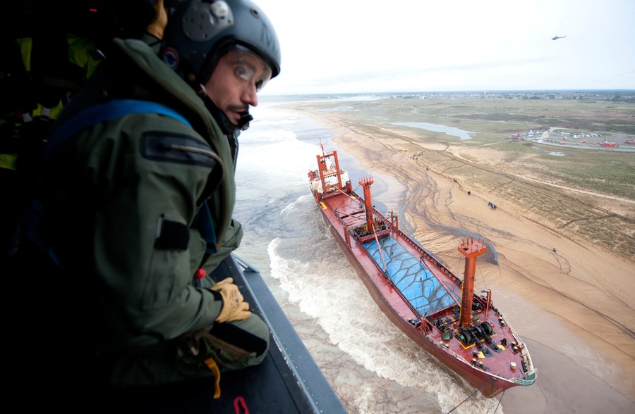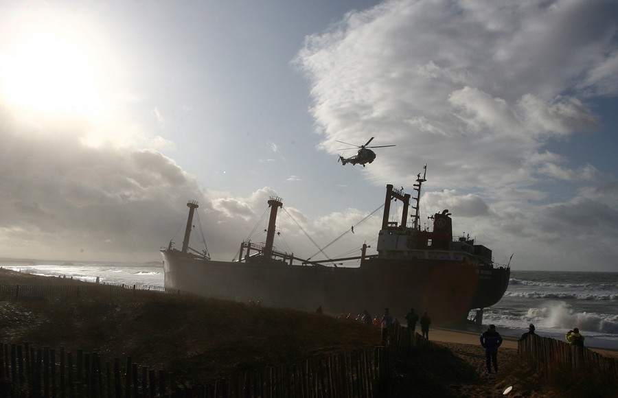 Read moreIn this image made available by France's Marine Nationale, the cargo ship TK Bremen sits stranded on a beach near Erdeven, France, on December 16, 2011, spilled fuel oil fouling the water. #