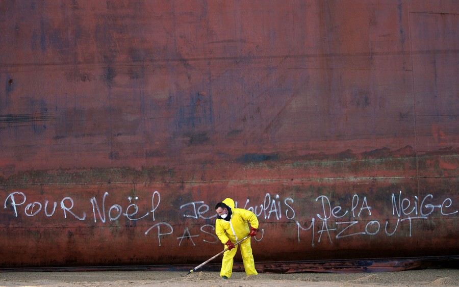 Read moreA French civil guard clears sand contaminated with fuel oil on Kerminihy beach after the TK Bremen cargo ship was stranded by high winds, on December 17, 2011. Graffiti on the side of the ship reads in French: "For Christmas, I wanted some snow, not fuel oil" #