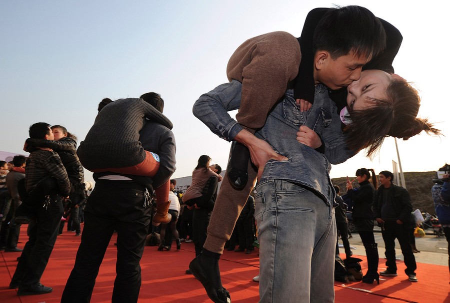 Read moreCouples participate in a kissing contest in Hefei, Anhui province, China, on February 18, 2012. A total of 63 couples took part in the contest in which men must hold their partners off the ground while kissing, trying to last as long as possible. The winner was awarded a 1-carat diamond ring, local media reported. #