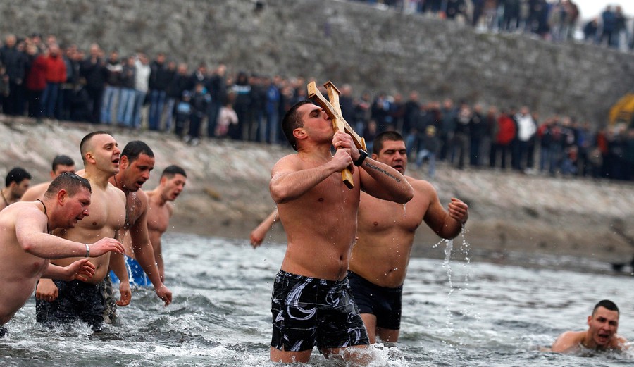 Read moreVladimir Stojanovic kisses a wooden cross that he managed to catch after it was thrown by a priest in the waters of Nisava river during Epiphany celebrations in Nis, south-eastern Serbia, on January 19, 2012. #