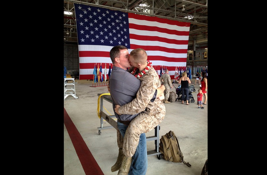 Read moreSgt. Brandon Morgan, right, is embraced by his partner Dalan Wells in a helicopter hangar at a Marine base in Kaneohe Bay, Hawaii, upon returning from a six-month deployment to Afghanistan in this February 22, 2012 photo. The photograph, made some five months after the repeal of the military's "don't ask don't tell" policy prohibiting gay servicemen from openly acknowledging their sexuality, is among the first showing a gay active duty serviceman in uniform kissing his partner at a homecoming. #