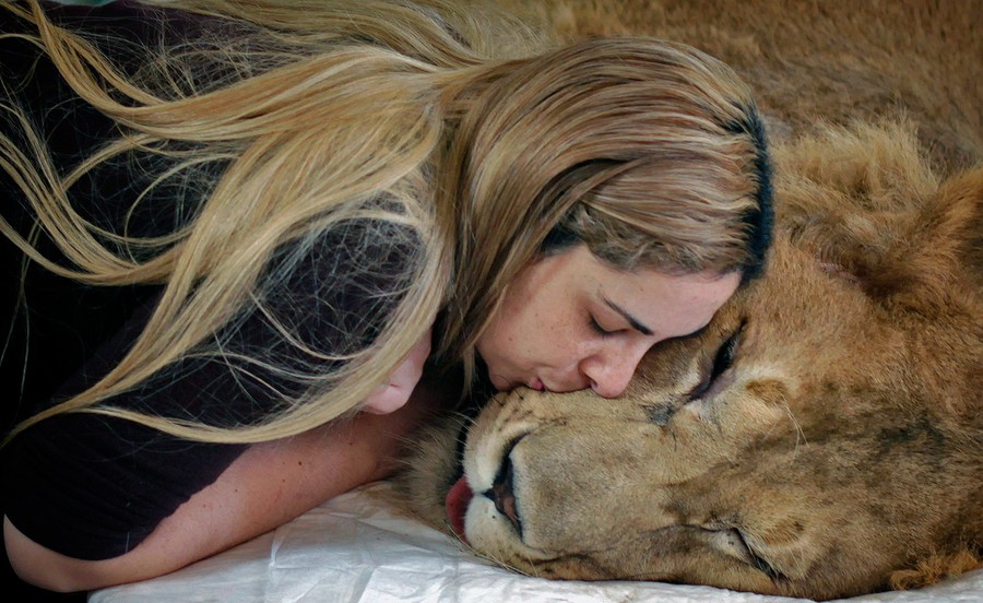 Read moreVeterinarian Livia Pereira kisses paralyzed lion Ariel who she is caring for in her home in Sao Paulo, Brazil, on July 13, 2011. An Internet and Facebook campaign was launched in Brazil to obtain funds needed to treat the lion that had been paralyzed for the past year. The campaign was launched by Raquel Borges, the owner of Ariel, a three-year-old, 310 pound (140 kilogram) lion that was unable to use his four legs due to a degenerative disease affecting his medulla. Ariel was unable to recover, and passed away a couple of weeks after this photo was taken. #