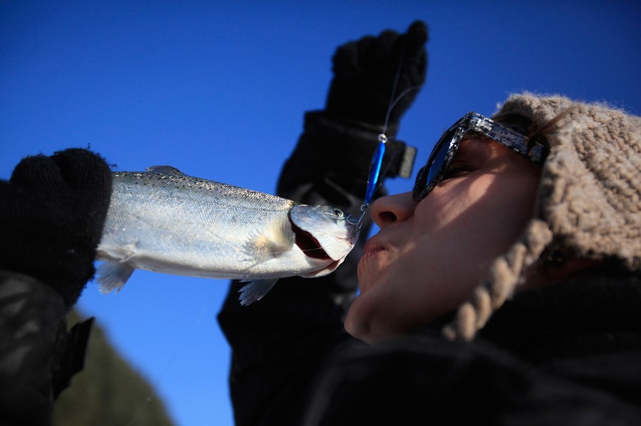 Read moreA woman kisses a fish after catching it during an ice fishing competition at the Hwacheon Sancheoneo Ice Festival on January 7, 2012 in Hwacheon-gun, South Korea. The annual Hwacheon Sancheoneo (Mountain Trout) Ice Festival attracts millions of visitors annually who gather to try their luck at ice fishing with traditional lures or with bare hands. #