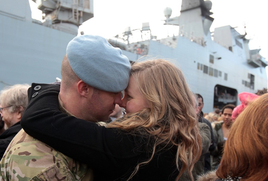Read moreSgt. Steve Lewis kisses his girlfriend Joanne White-Goldsmith as the HMS Ocean returns to Plymouth, England, on December 9, 2011. The HMS Ocean left Plymouth in April for a seven-week training exercise, but was diverted to Libya to support the UN air mission. #