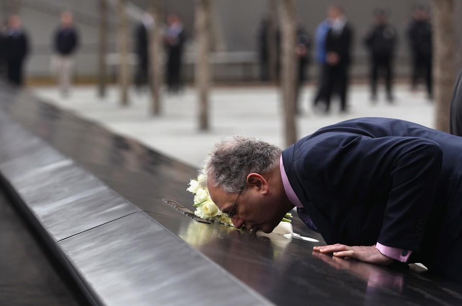 Read moreCharles Wolf kisses the name of his wife Katherine Wolf, a British citizen who died at Ground Zero during the 9/11 attacks at the World Trade Center Memorial in New York, on March 15, 2012. He accompanied British Prime Minister David Cameron and his wife Samantha on their visit to the site. #