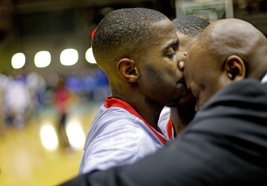 Read moreLaney High School's Raheem Newton, left, kisses the forehead of assistant coach Shilo Robinson after Laney defeated Manchester 67- 53 in the Boys AA state championship high school basketball game in Macon, Georgia, on March 10, 2012. #