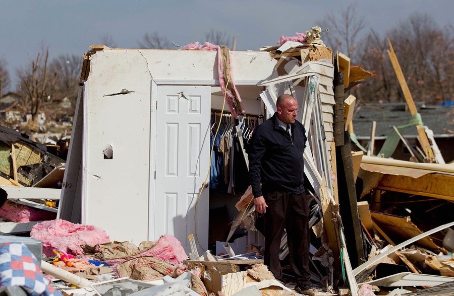 Read moreSteve McDonald stands outside a barely-standing closet, part of the damaged home of his mother-in-law, Mary Osman, who was killed after a tornado touched down February, 29, 2012 in Harrisburg, Illinois. #