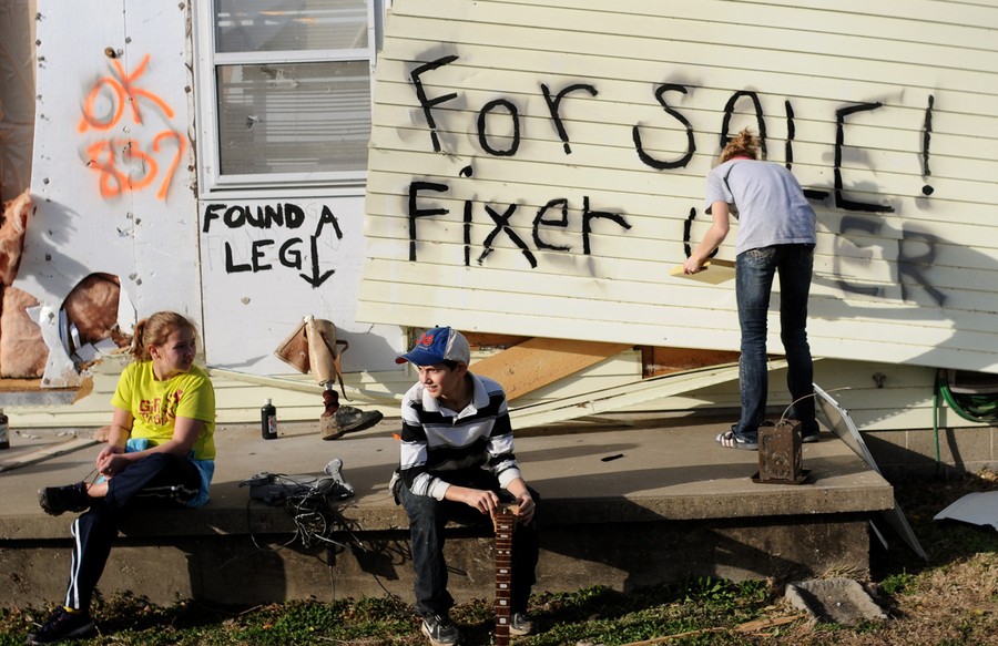 Read moreFrom left, Alli Ferrell, 10, and cousin Christian Murray, 12, sit on the front porch, as Lindsey Murray, 15, of Harrisburg, Illinois, paints "For sale! Fixer upper" on the side of the home of their grandmother, Sharon Murray, after a tornado destroyed the house in Harrisburg, Illinois, on February 29, 2012. A prosthetic leg (propped against wall) was also found among the wreckage. #