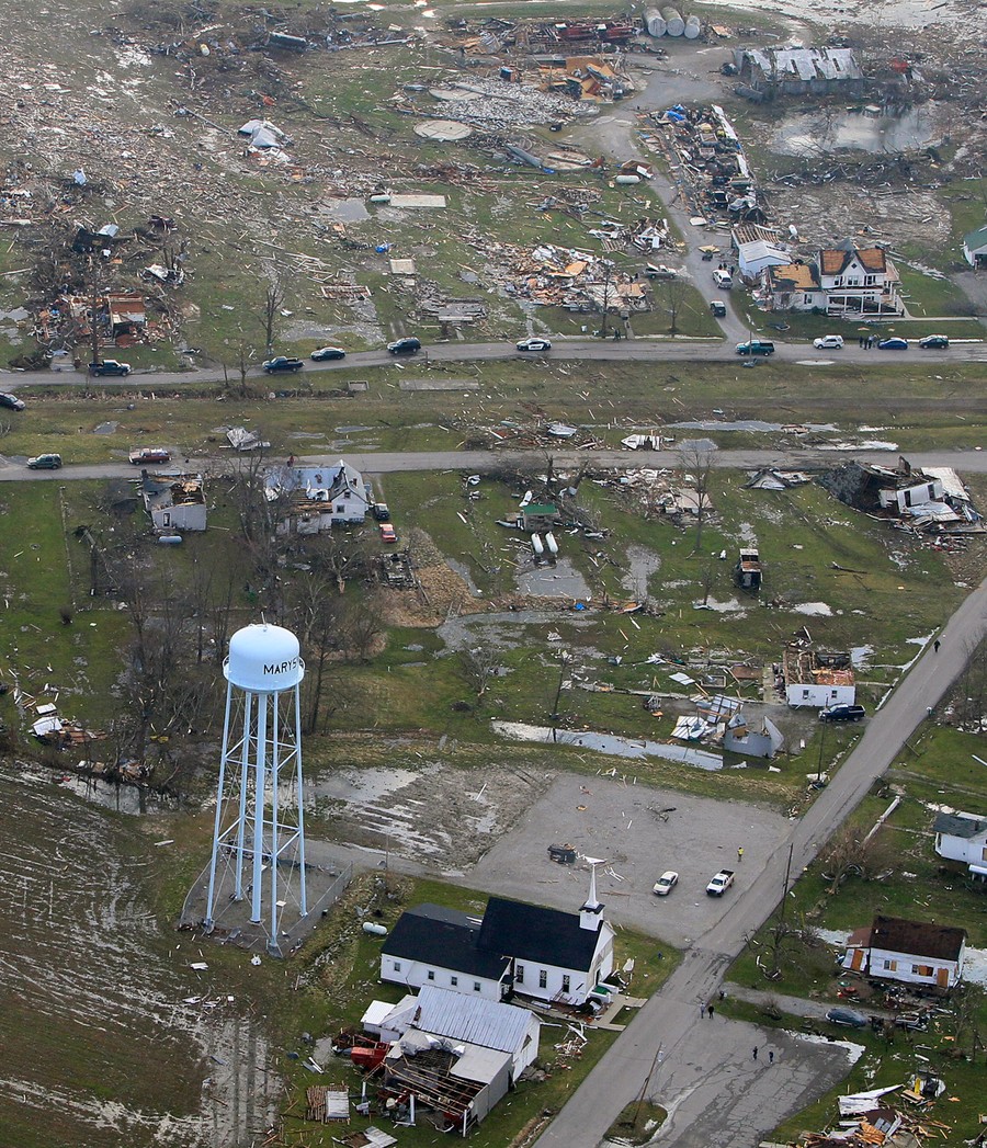 Read moreDebris is strewn about in this aerial photo of Marysville, Indiana, on Saturday, March 3, 2012, after a tornado swept through the area. To see what the small town looked like before last week, Google maps has a fairly detailed view. #