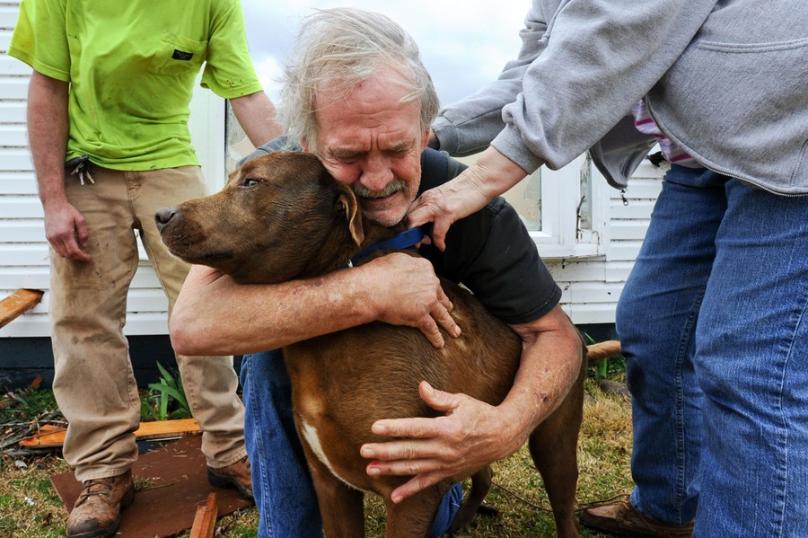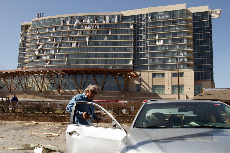Read moreMel Pulliam of Ridgedale, Missouri, helps his daughter pull belongings from her car that was damaged in the tornado that struck Branson, Missouri early on February 29, 2012. His daughter, Tracy Kimmel, was working at a restaurant on the Branson Landing when the storm hit. In the background is the Hilton Hotel, which was heavily damaged. #