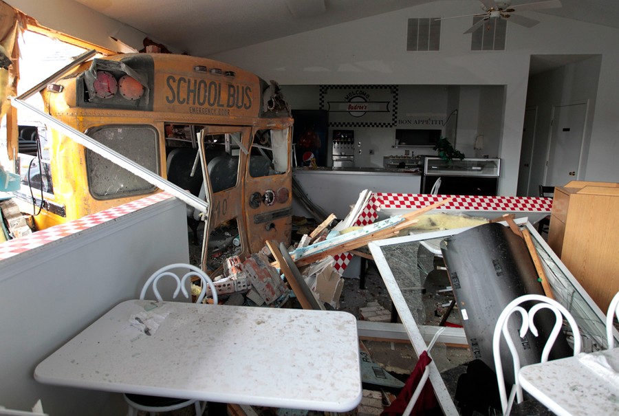 Read moreStudent Madeline Evans walks past a destroyed school bus after a tornado devastated the town of Henryville, Indiana, on March 3, 2012. Rescue teams and residents combed through storm-wracked towns to assess damage on Saturday from a chain of tornadoes that cut a 1,000-mile swath of destruction from the Midwest to the Gulf of Mexico. #