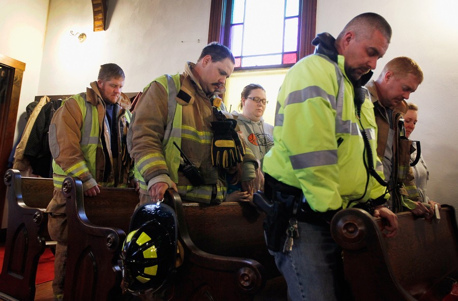 Read moreThe town of Holton fire fighters (from left) Shaun Kreider and Eric Grossman and Town Marshal Bob Curl (right) bow their heads in prayer during a non-denominational church service for people that lost loved ones or are dealing with their destroyed homes after a tornado passed through the town on March 4, 2012 in Holton, Indiana. The Holton Methodist Church held the service due to the other churches in town being too damaged to be used. #