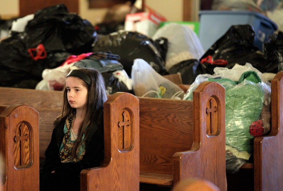 Read moreA girl attending mass at St. Francis Xavier Catholic Church sits in a pew in front of clothing and supplies that have been collected to aid victims of a tornado in Henryville, Indiana, on March 4, 2012. The church was in the path of a tornado that destroyed much of the town. #