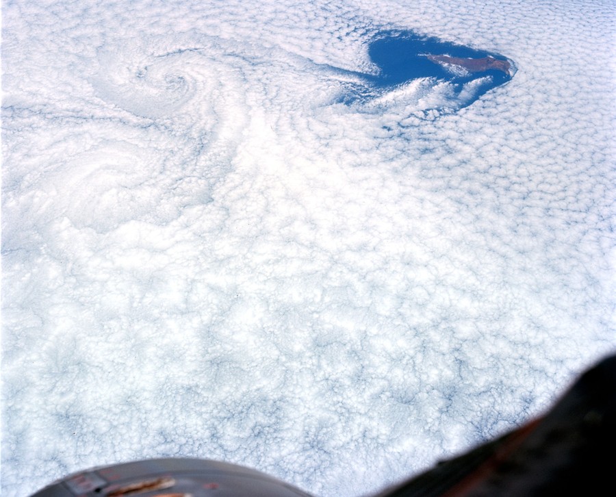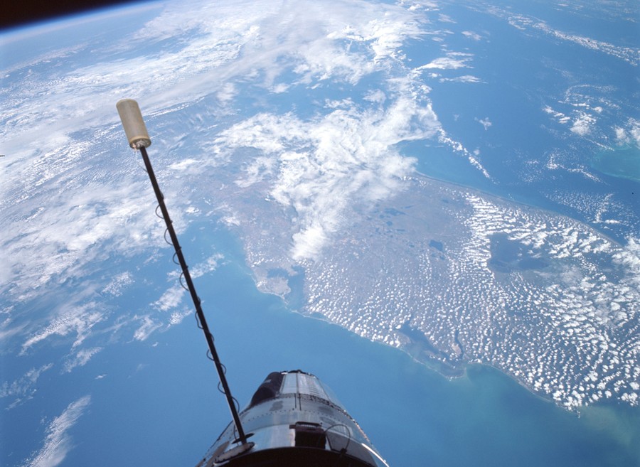 Read moreAbove Isla La Tortuga, off the coast of Venezuela, a view of the "angry alligator" from a range of 85ft. Gemini 9A astronauts were planning to dock with the Augmented Target Docking Adapter (ATDA), but canceled their plans when they discovered its protective shroud still attached. #