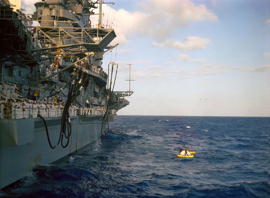 Read moreThe USS Intrepid pulls up alongside the Gemini-3 spacecraft during recovery operations following the successful Gemini-Titan 3 flight, on March 23, 1965. Navy swimmers stand on the spacecraft's flotation collar waiting to hook a hoist line to the Gemini-3. #