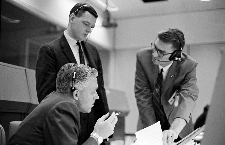 Read moreFlight director John D. Hedge (left), chief, Flight Control Division; Glynn S. Lunney (standing left), chief, Flight Dynamics Branch, Flight Control Division; and James W. Beach, assistant flight director for Gemini-Titan 3, are shown in the Mission Control Center, Houston, Texas during the Gemini-Titan 3 flight, on March 23, 1965. #