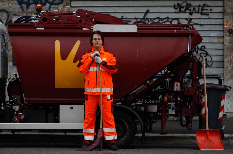 Read moreFrancesco Foglia, 37, at work as a street sweeper in downtown Rome, on April 29, 2012. Foggia studied for six years at university in Rome where he received a degree and a doctorate in industrial chemistry. He hoped to find a job as a researcher but has been working as a street sweeper for Rome's municipality for two years. #