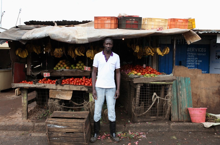 Read moreKarl Moi Okoth, a 27-year-old vegetable and fruit seller, in front of his makeshift shop in Nairobi's Kibera slum in the Kenyan capital, on April 30, 2012. Okoth studied psychology and chemistry at Day Star University where he received a degree in psychology. He has been searching for permanent employment for four years but has decided to make a living working in the slums for the last eight months. #