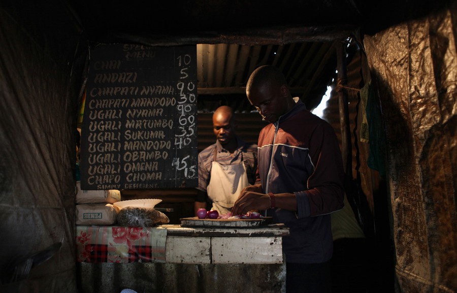 Read moreDenis Onyango Olang (right) a 26-year-old assistant cook, prepares food in a dimly lit kitchen at a hotel in Nairobi's Kibera slum in the Kenyan capital, on April 30, 2012. Onyango Olang studied statistics and chemistry at Jomo Kenyatta University of Agriculture and Technology where he received a degree in science. He has been searching for permanent employment for two years but has decided to make a living working in the slums for the last eight months. #