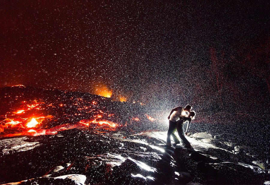 Read moreLava Kiss: My husband and I, along with a tour guide and a group of friends, hiked up to what was formerly the Royal Gardens subdivision above Kalapana, Hawaii, where the last standing house was just recently taken over by the active lava flow. While waiting for the rain to pass, we started taking back-lit portraits of each other in front of the lava flow after I set up my camera on the tripod. For the last photo, my husband spontaneously dipped me in a kiss. It was a truly once-in-a-lifetime moment! #