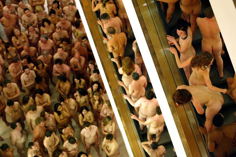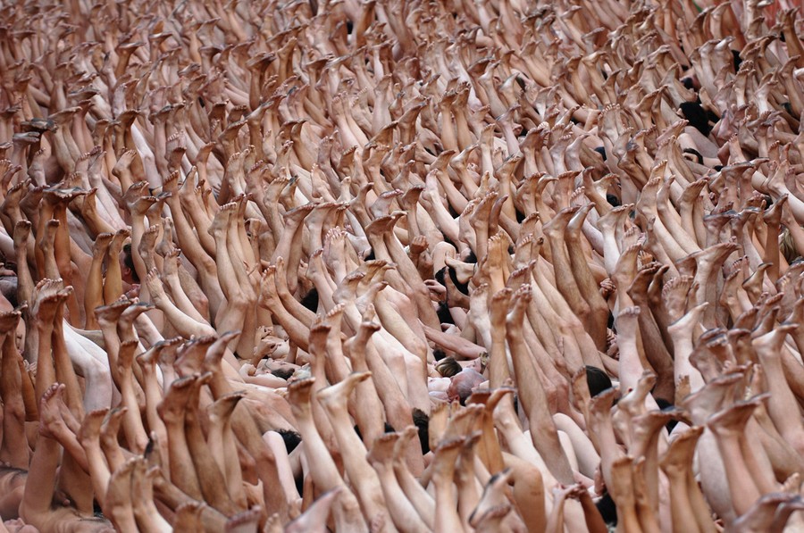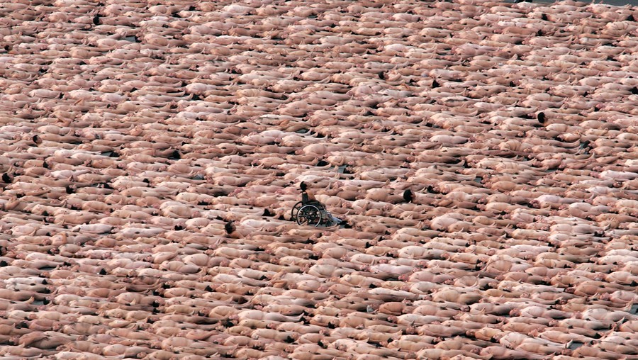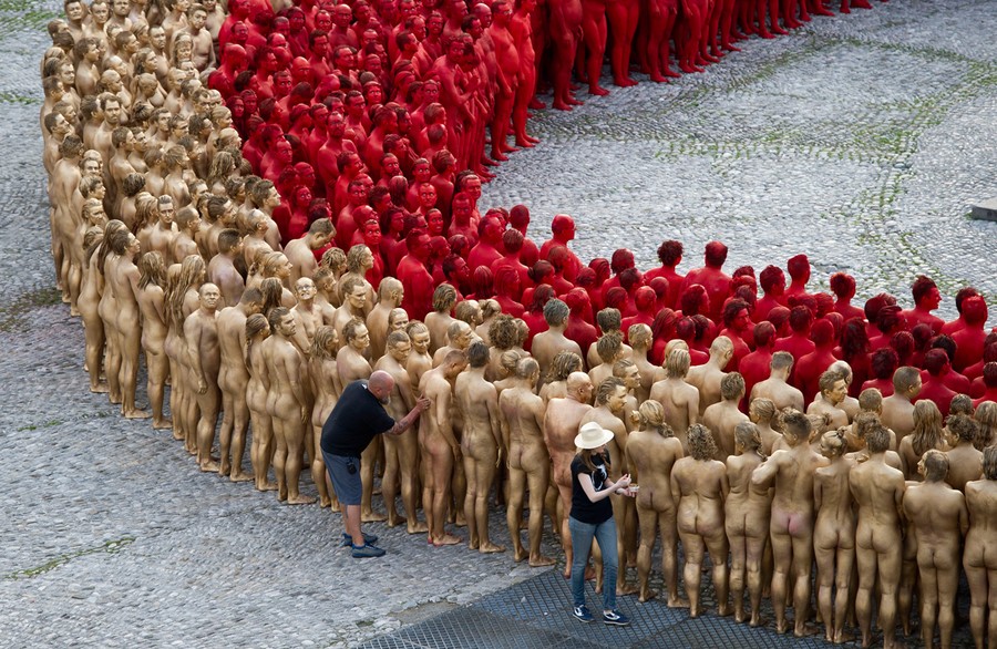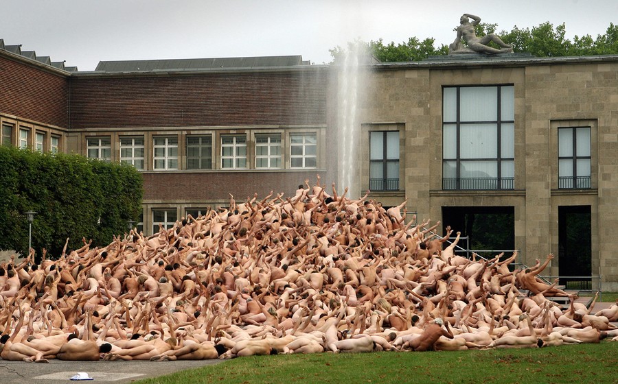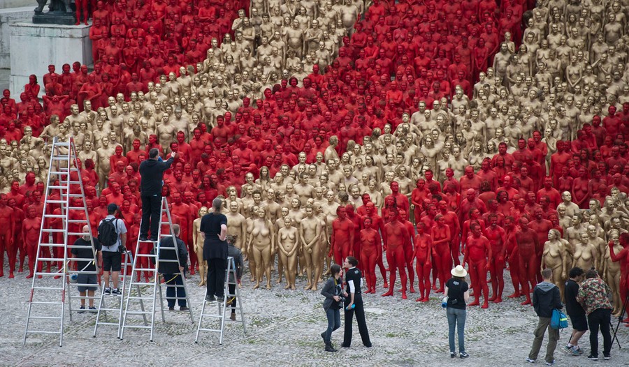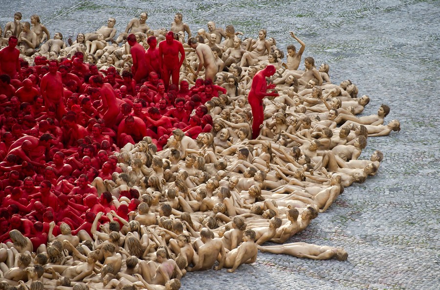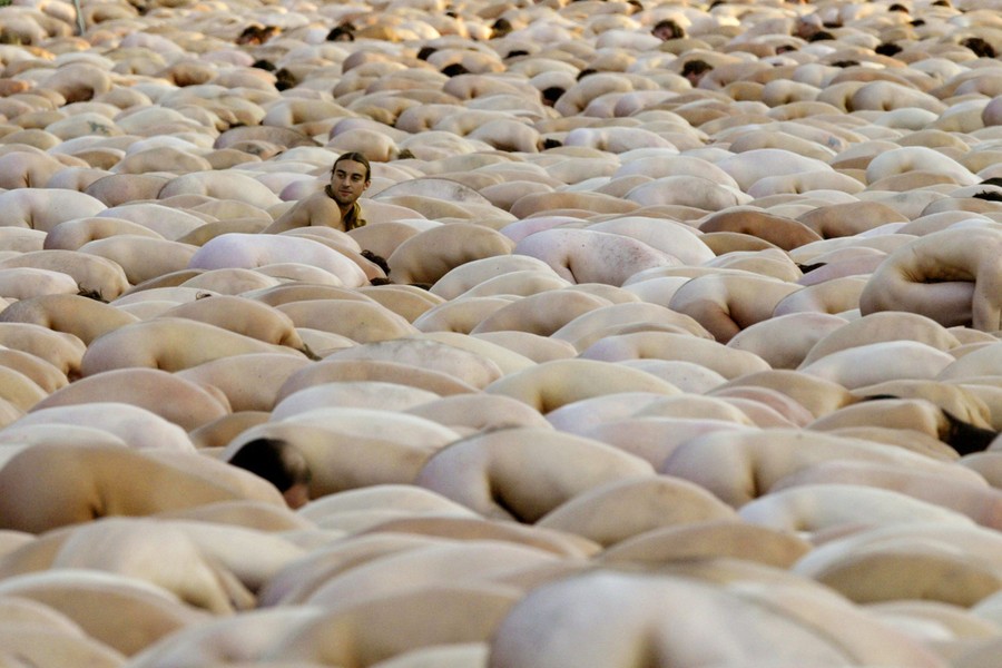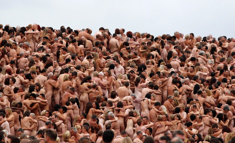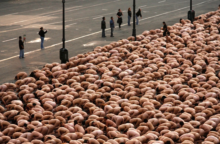For 20 years now, New York-based photographer Spencer Tunick has been creating human art installations all over the world, calling together volunteers by the hundreds or thousands, asking them to remove their clothes, and photographing them in massive groups. His philosophy is that "individuals en masse, without their clothing, grouped together, metamorphose into a new shape." He aims to create an architecture of flesh, where the masses of human bodies blend with the landscape, or juxtapose with architecture. Collected here are images from several of his installations as they were being composed. Warning: The following photos all depict naked human bodies, and are not screened out. The nudity is central to Tunick's art.