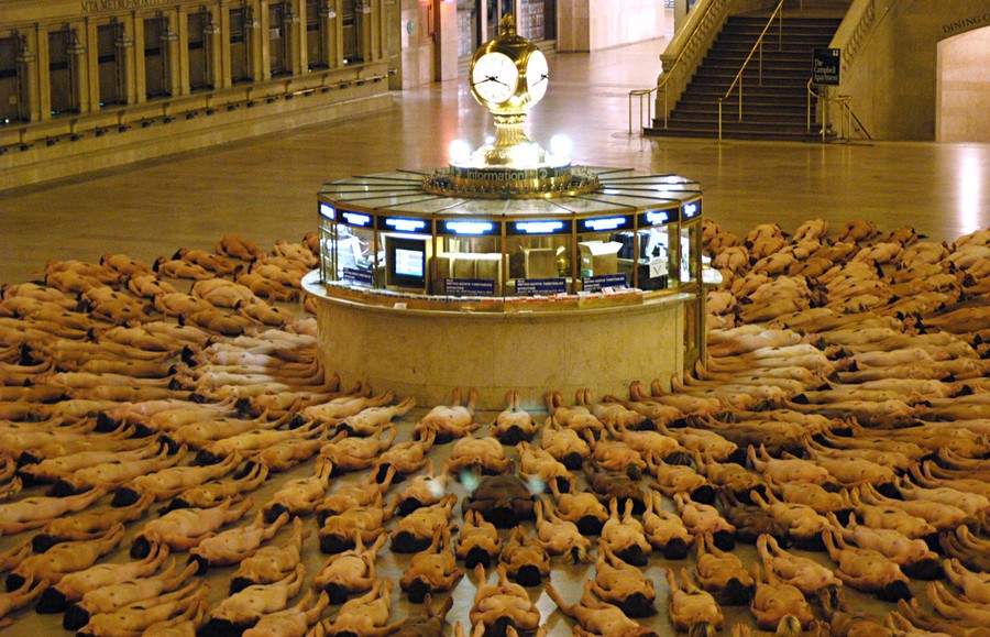 Read moreFour-hundred and fifty unclothed women are arrayed on the floor around the information booth in New York's Grand Central Terminal as they are photographed by artist Spencer Tunick as part of a human art installation, on October 26, 2003. The women - all volunteers - arrived at Grand Central at about 3 a.m., stripped off their clothes, and composed their bodies into sculptural shapes and formations meant to imitate streets, buildings and cityscapes. #