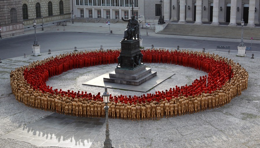 Read morePhotographer Spencer Tunick (3rd from left) directs several hundred naked volunteers covered in body paint on the stairs in front of the opera on Max-Joseph-Platz in Munich, on June 23, 2012. Around 1,700 people attended Tunick's latest project in the center of the Bavarian capital. #