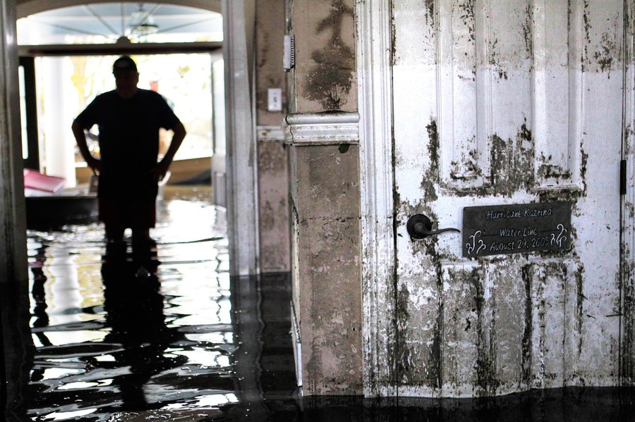 Read moreDon Duplantier walks through his flooded home as water recedes from Hurricane Isaac in Braithwaite, Louisiana, on September 2, 2012. In the foreground is a sign marking the waterline from Hurricane Katrina, but floodwater from Isaac went all the way up to the second floor. #