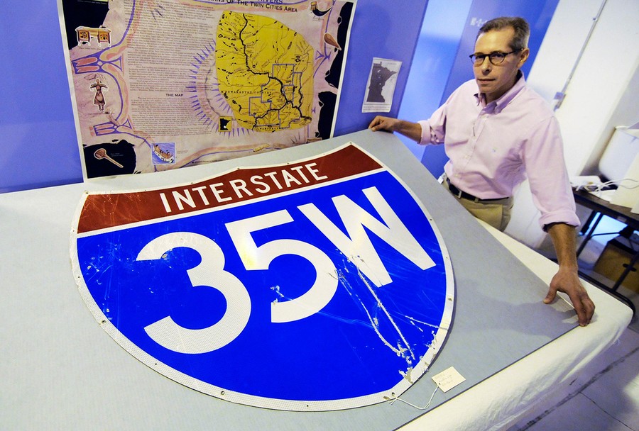 Read moreIn St. Paul, Minnesota History Center senior curator Adam Scher shows a damaged bridge highway sign, one of a collection of artifacts at the History Center from the disastrous Interstate 35W bridge collapse in Minneapolis, that took place on August 1, 2007. Photo taken on July 26, 2012. #