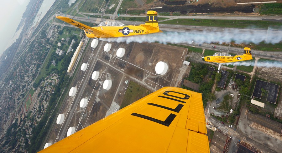 Read moreThe Lima Lima Flight Team flies near the Gary/Chicago International Airport above Gary, Indiana, on August 16, 2012. The planes, Beech T-34 Mentors, were used as training aircraft for the U.S. Navy and Air Force during the 1940's. #