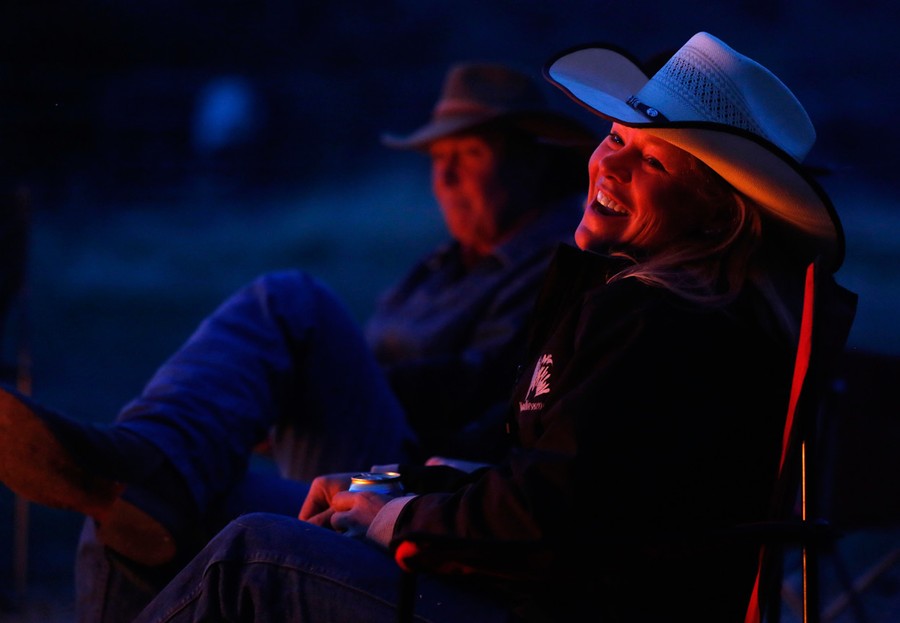 Read moreWrangler Denise Boyd laughs by the campfire during Montana Horses' annual horse drive outside Three Forks, Montana, on May 4, 2012. The Mantle family, who own Montana Horses, held their last horse drive where they rounded up approximately 300 horses and drove the herd 35 miles from their winter range to the Mantle ranch. #