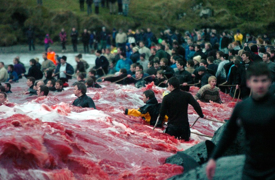 Faroe Islanders catch and slaughter pilot whales during the traditional 'Grindadrap' near Tórshavn, on November 22, 2011. Descendents of Vikings, and pilot whales have been a central part of their diet for more than 1,000 years. 'Grindadrap' whaling is not done for commercial purposes, the meat can not be sold and is divided evenly between members of the local community.#