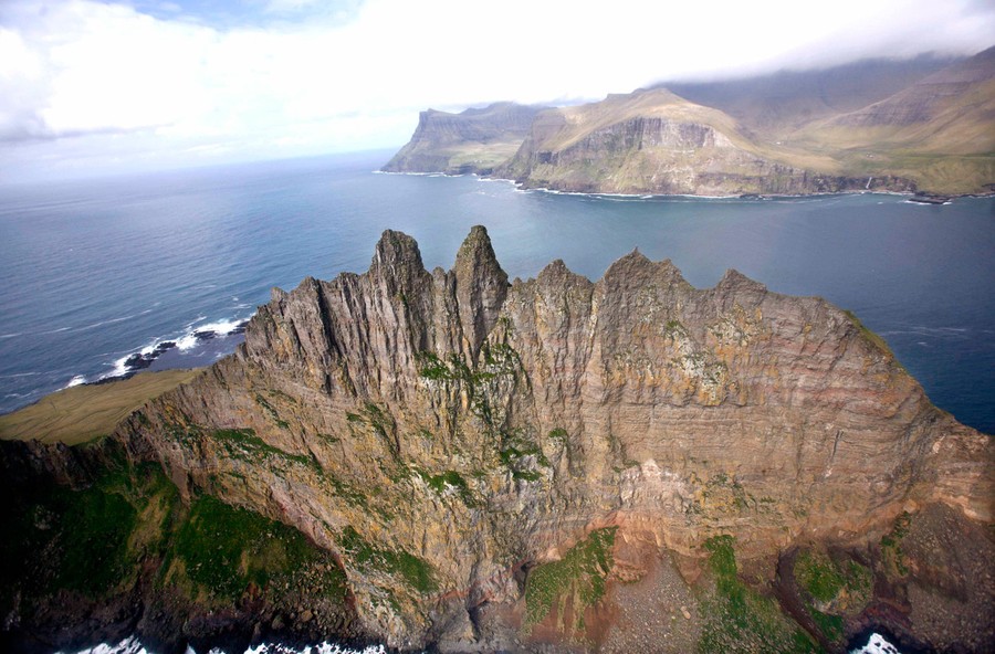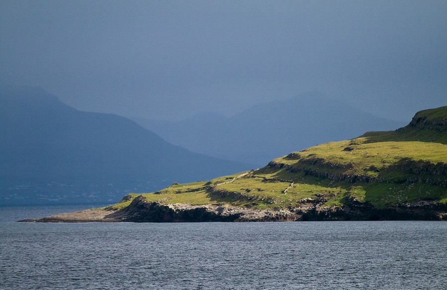 Tindhólmur, a small island in Sørvágsfjørður, a fjord on the west side of Vágoy in the Faroe Islands. Each of the small peaks has its own name: Ytsti, Arni, Lítli, Breiði, and Bogdi. Original here.#