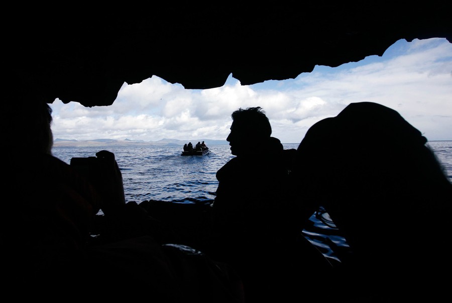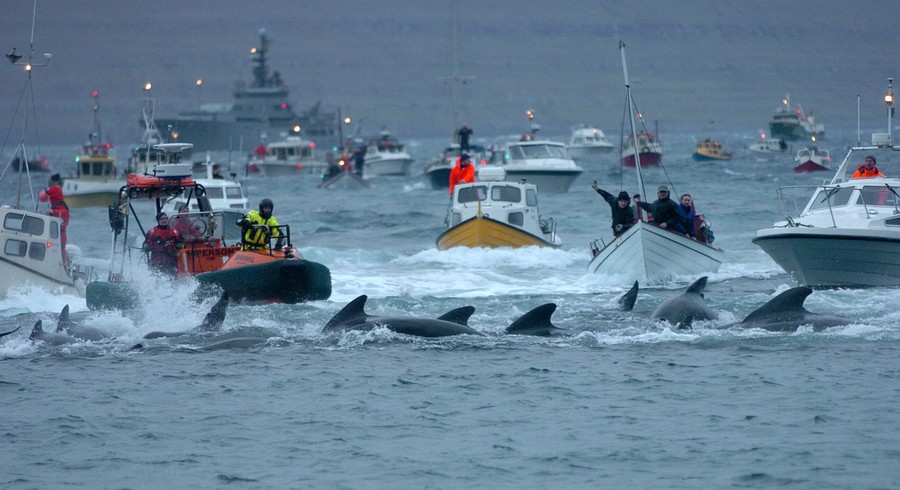 Inhabitants of Faroe Islands drive pilot whales during their traditional 'Grindadrap' (whale hunt in Faroese) near the capital Tórshavn, on November 22, 2011. Residents of the Faroe Islands, an autonomous province of Denmark, slaughter and eat pilot whales every year.#