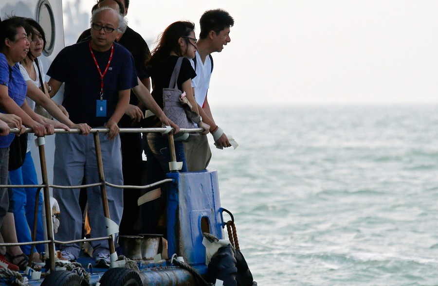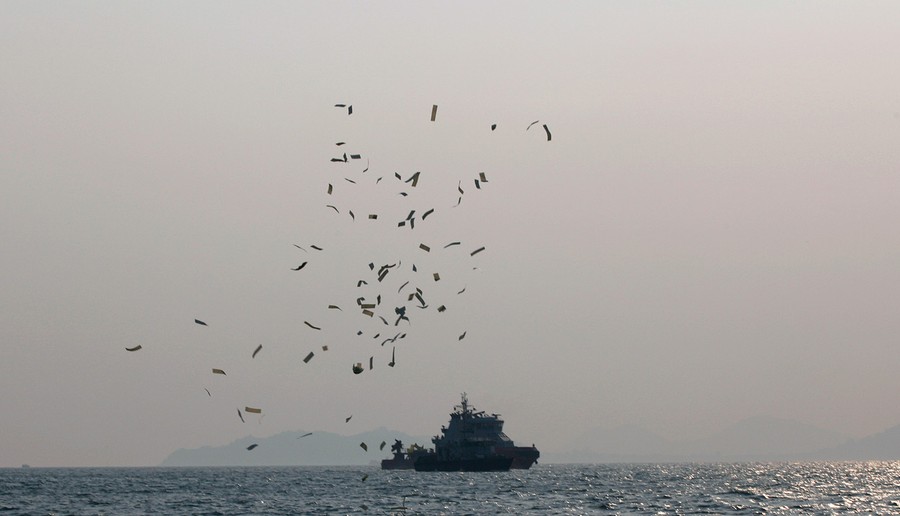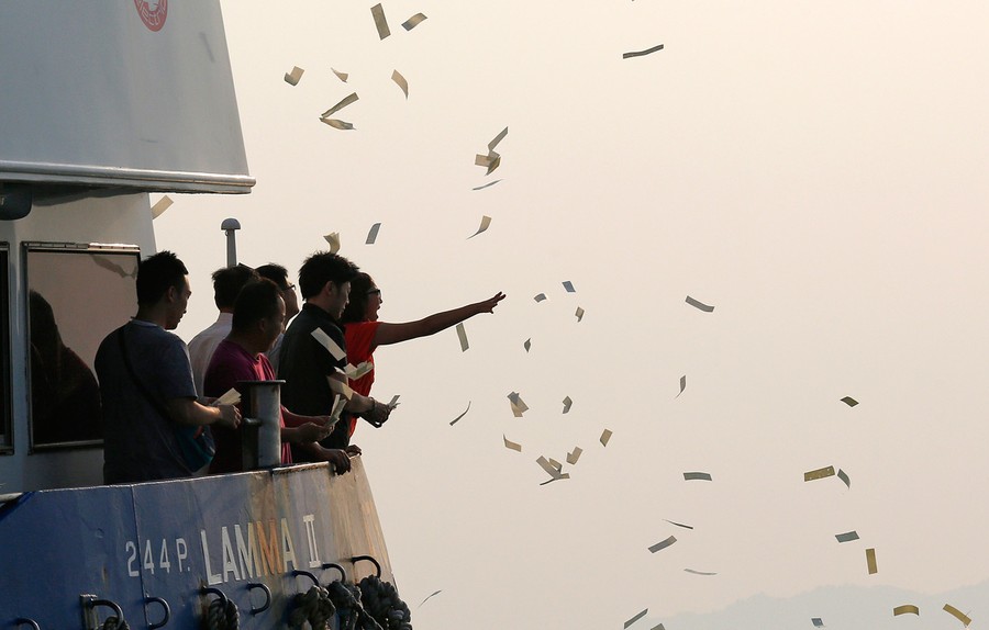 Read moreRelatives of the victims throw paper money Tuesday, October 2, 2012 as they pay tribute to the ill-fated people aboard the Lamma IV that sank Monday night near Lamma Island. #