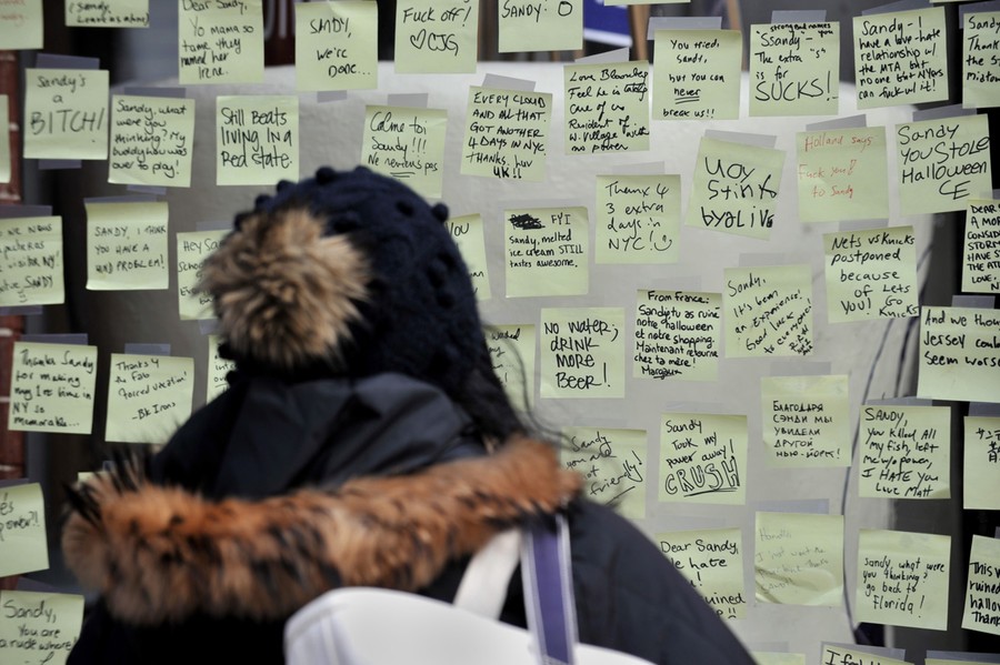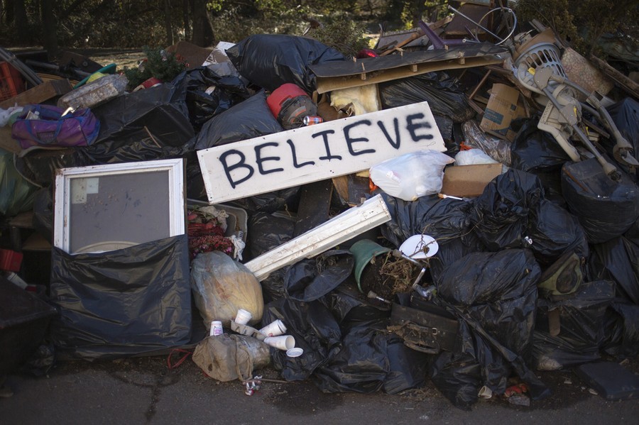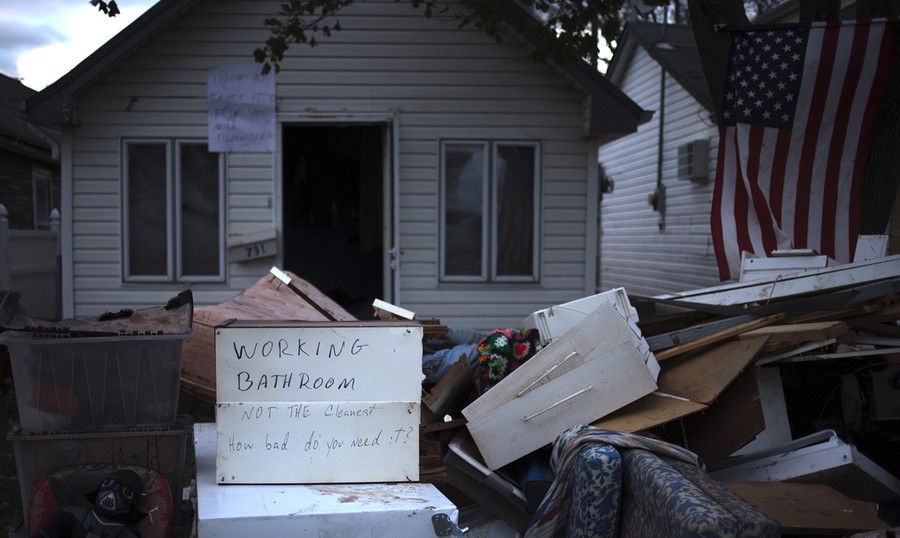 A message reading "Working Bathroom. Not the cleanest. How bad do you need it?", left on flooded belongings outside a house hit by hurricane Sandy in Staten Island, on November 3, 2012.#