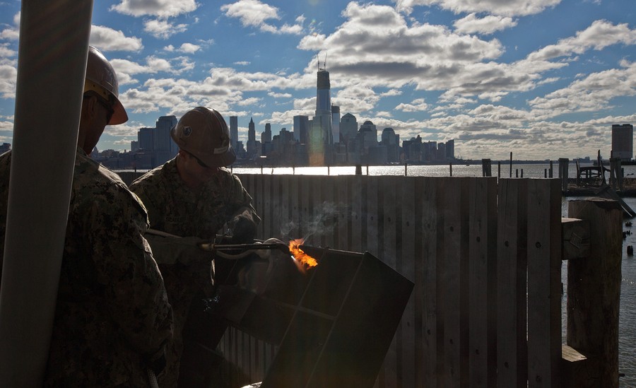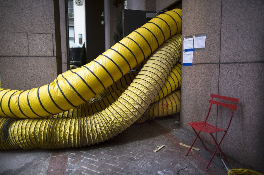 Ventilation pipes pile into a building in the Financial District of Lower Manhattan, as cleanup from damages caused by Superstorm Sandy continue, on November 5, 2012, in New York.#