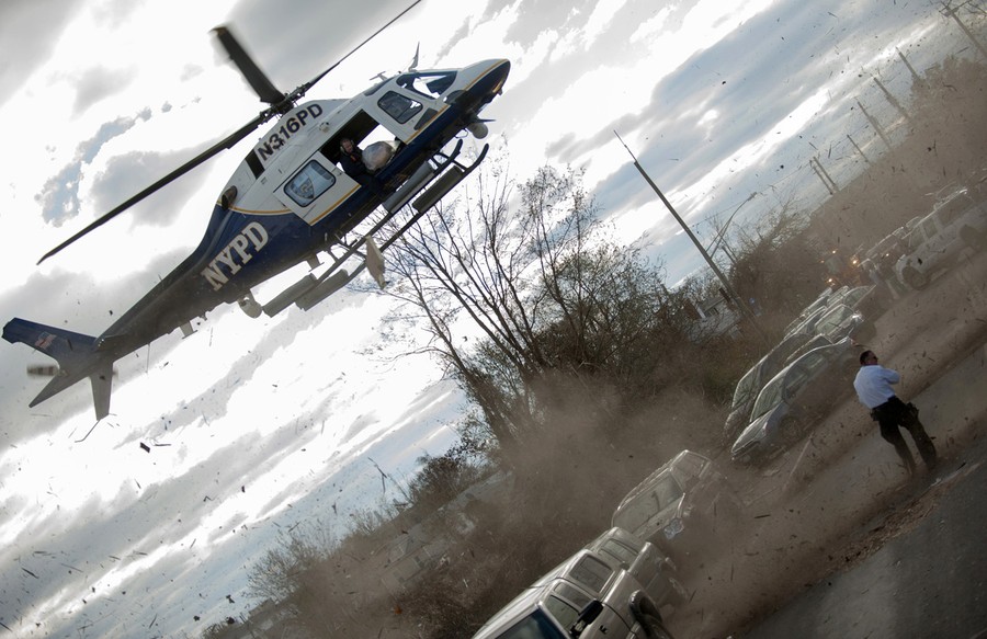 A police helicopter hovers as it drops supplies for residents in the Staten Island Borough of New York, on November 3, 2012 in the aftermath of Hurricane Sandy. Northeast residents lucky enough to have a roof after Hurricane Sandy struck now face a new problem: a heating oil shortage and widespread power outages mean some homes may go cold as the weather turns wintry.#