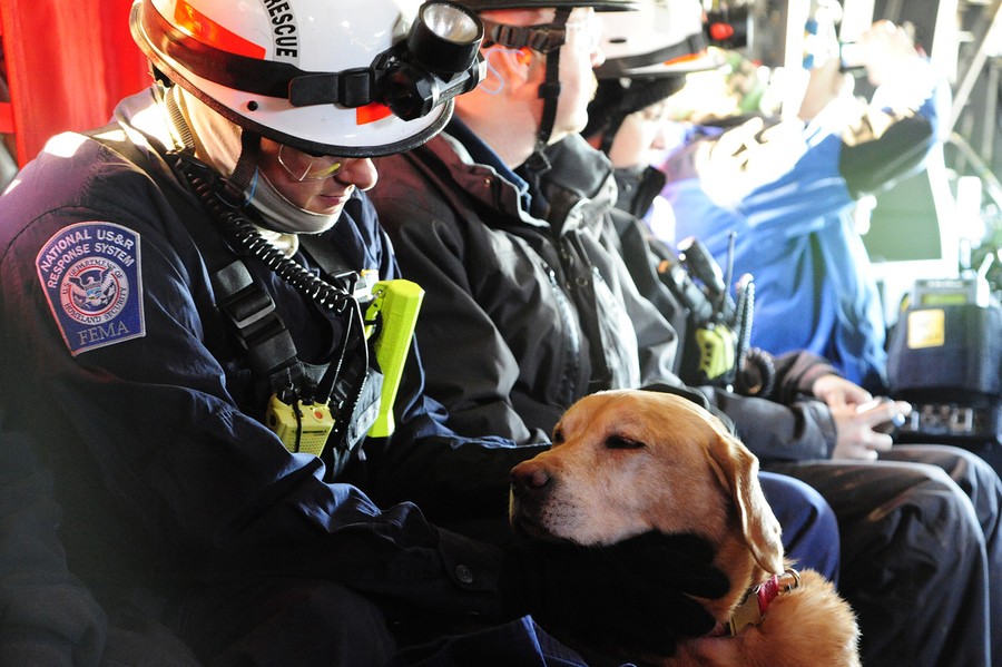 Dominic Dipietco, a specialist with the Maryland Urban Search and Rescue Task Force, with search dog Jed, aboard a U.S. Army CH-47 helicopter assigned to the Georgia Army National Guard on a flight from Joint Base McGuire-Dix-Lakehurst, New Jersey, to Staten Island, New York, to conduct house-to-house searches, on November 3, 2012.#