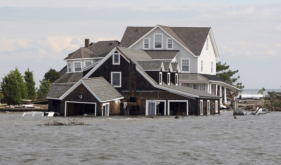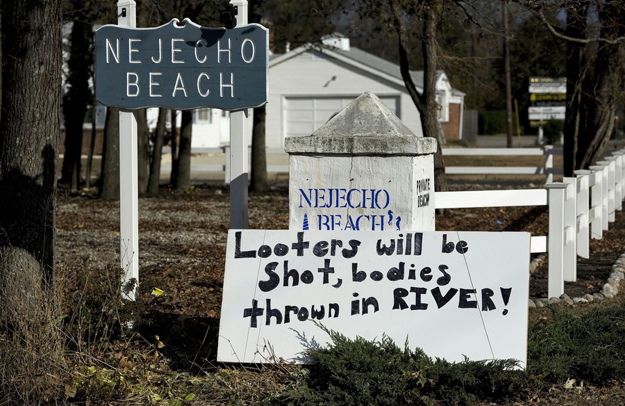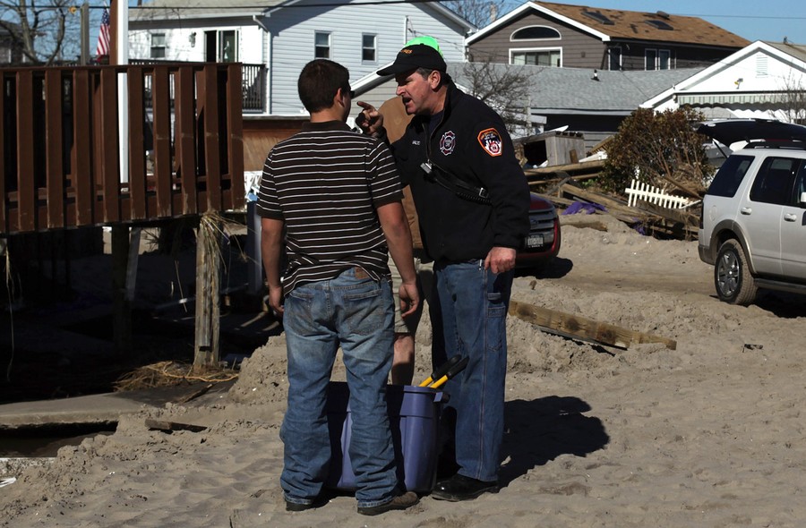 A member of the Fire Department confronts a boy who was taking copper piping from a neighbor's home in the Breezy Point neighborhood of Queens, on November 4, 2012.#