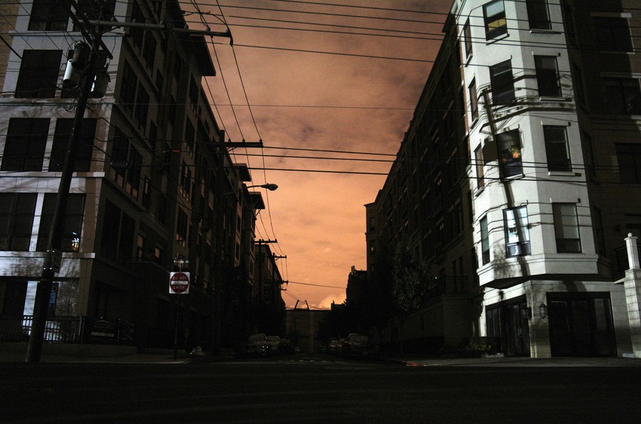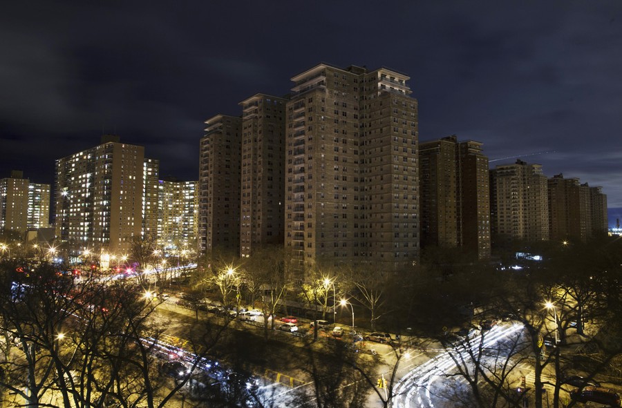 A block of high-rise apartment buildings that remain devoid of power, heat, and water stand in front of other buildings that have their utilities intact in the Brighton Beach neighborhood of New York, on November 2, 2012.#
