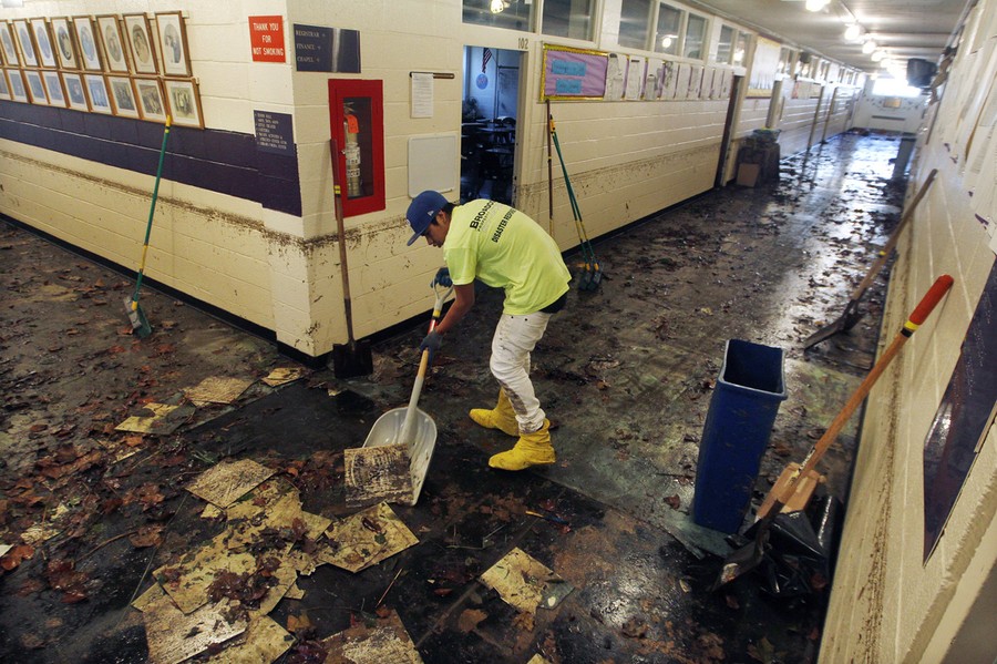The high-water mark is visible on the walls behind a worker, as he scrapes up mud and tiles from flood-damaged Saint Rose High School in Belmar, New Jersey, on November 4, 2012.#